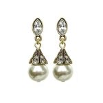 These art deco pearl earrings bring traditional style to anything you wear with them. The pearls are made of glass composition with lustrous, pearly nacre. The white pearls are mounted with silver finished canopies and posts set with Swarovski shade crystal. The cultura pearls have vintage bronze mountings set with the same crystal. Ever lovely, these could be a wedding earring for bride or bridesmaids, to be worn as favorites long afterward. Pearls have been the most essential and stylish jewelry of all time. They are a fashion basic, now and forever. Sweet Romance Style E541br>