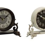 Set of two ornate metal table clocks, features bold Arabic and Roman numeral on each clock face.