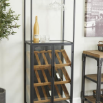 This standing wine rack has a spacious display bar for your favorite bottles as well as overhead glass holders.