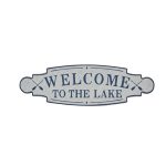 Large oval emblem-shaped metal beach sign with muted white and dusty blue hues