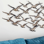 Polished bronze wall art for living room takes on an interesting shape with bird figures arranged in a flying formation that resembles a cluster shape.