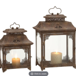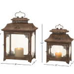 This metal candle lantern has a distressed brown finish for an aged appearance