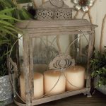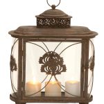 Metal candle lantern has a distressed brown finish to match a rustic theme