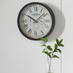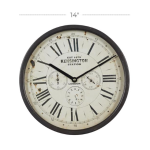 Matte brownish-black finish over housing, distressed clock face with Roman numerals and smaller dials.