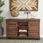 Rustic wooden buffet accentuates a rectangular overall form that shows distinct horizontal wooden slab patterns.