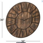 This farmhouse style inspired metal and wood clock features a beautiful aged wooden slat pattern on the clock face with black roman numerals and black clock hands in a distressed finish
