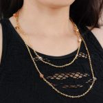 Long, airy, slinky layering necklace from our Living In Layers collection. Tiny spiral cages hold glass beads in coral, green and blue along a vintage oval cable chain. Wear it long, doubled or tripled. Mix it up with our other chain and bead necklaces to get that dreamy retro Boho style. 14K gold plate.