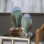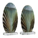 Reactive glazed ceramic fan sculptures, comprised of blues, greens and bronze, set on tonneau-shaped crystal bases.