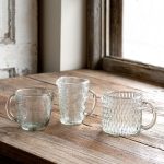 This set of 3 assorted pressed glass, vintage-inspired patterned glass pouring cups are ideal to hold cream for your coffee or even as a vase for a small bundle of flowers on your kitchen table.