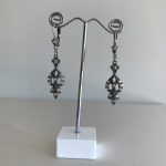 This graceful art deco openwork earring design, called an arabesque, is set with crystal shade Swarovski stones and suspended from leverback earrings with a complementary motif. They create a dreamy, elegant vintage mood, the perfect earrings for brides and bridesmaids. Choice of burnished silver or bronze. From our Cafe Society colleciton. Made in our Los Angeles, CA studio. Style E1226Â