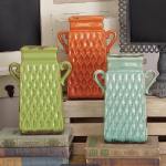 Each vase is molded with two side handles and a rectangular opening that lengthens towards the base