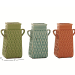 This 3-in-1 set of flower trapezoid-shaped vases features a scale-like design, two side handles, and a rectangular opening in each piece.