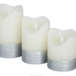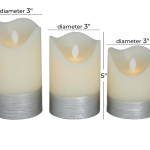Each silver wax flameless candle measures 3.05L x 3.15W x 4.80H , 3.10L x 3.10W x 5.75H, 3.10L x 3.10W x 3.95H inches, and collectively weighs 1.61 lbs.