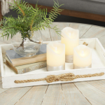 Round decorative flameless candles set displays a cream white finish with elegant silver accents at the base.