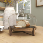 A dome shaped glass cloche with solid pattern and round finial top, and four wood legs under the base.