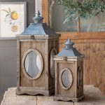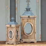 Inspired by architecture, these dormer lanterns feature slate blue metal tops, reclaimed wood, and oval glass panes.