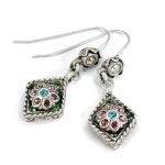 Baroque style marquis shape elements are rich with detail–hexagonal rosette is bordered with a tiny scroll of twisted wire.