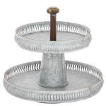 Iron is sculpted and given a galvanized finish to form a classic metal 2-tiered tray stand.