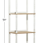 The white wood shelving unit measures 25L x 14.25W x 70.63H inches, and weighs 18.50 lbs.