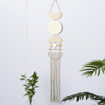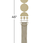 This geometrical wall art showcases hanging metal plates in diamond, circle, and half-circle It also features a long linen tail for that added soft touch