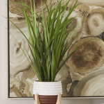 An artificial plant that comes in realistic green grass with white and brown corrugated porcelain pot on a brown 4-legged wooden stand