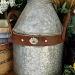This farmhouse style inspired design gray galvanized iron milk can features a traditional milk can made from hammered galvanized iron sheets complete with dimples on the surface and a metal handling fixing
