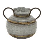 This metal vase features a round pot profile complete with 2 curved handles on the sides and with distressed accents