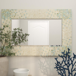 The rectangle hanging wall mirror boasts a polished off-white shell finish in a cream color, accented by aqua shells in the corners that provide an opalescent touch.