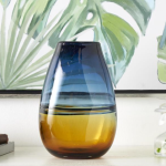 The tinted blue vase for faux flowers has a wide, wavy opening and features a stunning ombre effect with a banded center.