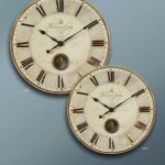 Weathered, laminated clock face with brass center components and internal pendulum.