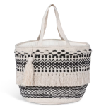 Our Janis Fringe Cotton Basket offers a bold look while remaining neutral in tone. The classic contrast of black and white add variance and modernity to the woven pattern of the woven basket, which includes handles for use as a carry-all bag, or can be styled as a pot cover if lined.