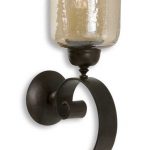 Hand forged, antiqued bronze metal with transparent amber glass. Includes one 3″x 3″ ivory candle.