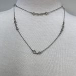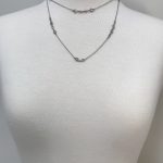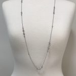 Long, airy, slinky layering necklace from our collection. High quality cubic zirconia chaton stones are channel set along a delicate cable chain. One, two and three stone stations impart a casual, yet luxurious look. In any lighting, the quality of the czs give the illusion of a yard of diamonds. Wear it long or doubled. Layer it with our other chains or your diamond solitare. Choice of silvery rhodium or hematite finish.Â
