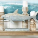A smiling shark is swimming on a blue base with textured distressed finish.