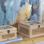 Bohemian storage boxes are crafted from a combination of natural wood and MDF, with a glass top and rattan accents.