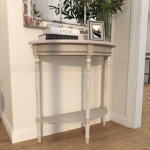 Half moon shaped side table carries a faint whitewash finish with distressing all overall for an a rustic look.