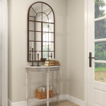 White wood side table features pillar style posts with solid bottom shelf in a half-round shape structure that offers seamless adjacent wall installation.