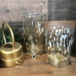 This hurricane Vase is highlighted by white and amber mottled glass in a luster finish which glows when lit with a candle.
