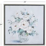 This canvas wall art highlights a muted pastel tone painting of white roses with green leaves placed in a vase for a realistic look