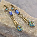 Swingy drop earrings inspired by the geometric style of mid-century 1960s and the color fusion of today. Millefiori art glass beads are set in open back frames, allowing light to fill the art glass. Swarovski crystal accents. Burnished bronze finish.