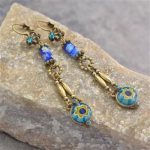 Swingy drop earrings inspired by the geometric style of mid-century 1960s and the color fusion of today. Millefiori art glass beads are set in open back frames, allowing light to fill the art glass. Swarovski crystal accents. Burnished bronze finish.