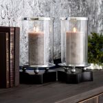 The set of two is tastefully designed with attention to many compelling details. The glass chimneys are accented on each end with metal rings. The feet are charming metallic orbs supported by a wooden base in a black finish.