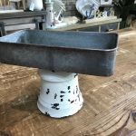 Like a find in a store full of country antiques, this metal pedestal tray is a perfect example of the found objects trend.