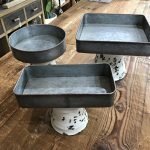 Galvanized metal trays are mounted atop vase-like stands with a crackled white paint finish for a weathered appearance.