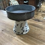 Like a find in a store full of country antiques, this metal pedestal tray is a perfect example of the found objects trend.
