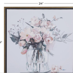 This tan framed canvas wall art features a glass flower vase with an array of pink, purple, and white flowers