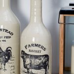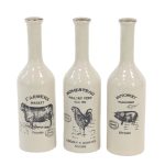 This set of vases features bottle-shaped vases with long necks and designed with cow, chicken, and pig illustrations