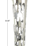 The silver aluminum metal vase measures 8.65L x 8.15W x 31.35H inches, and weighs 7.52 lbs