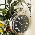 This wall clock is inspired by traditional pocket watch, featuring a round silver frame with decorative crown