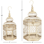These decorative birdcages have a cylindrical shape and crisscrossing vertical bars with floral embossed design.